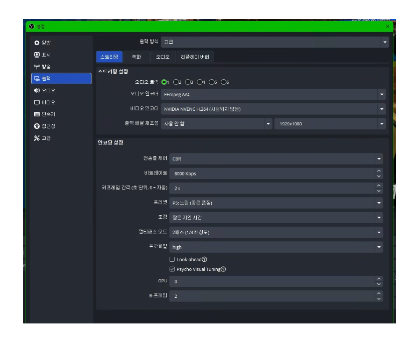 일반적으로 나오지 않는 증상이라 확실치는 않은데, 스트리밍 출력 설정의 비디오 인코더가 H.264(사용되지않음)이라 이걸 정상적인 Nvidia NVENC h264로 바꿔보시고, 그래도 문제가 생기면 그래픽카드 드라이버 완전삭제 후 재설치, OBS버전 변경등을 시도해보세요.