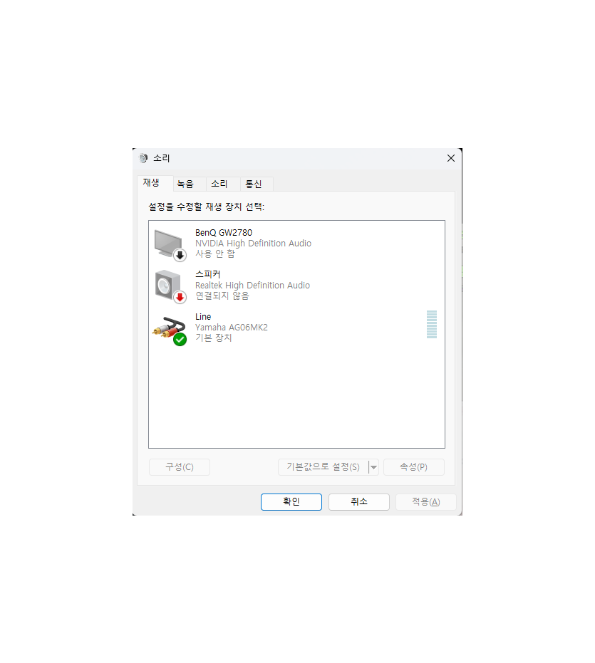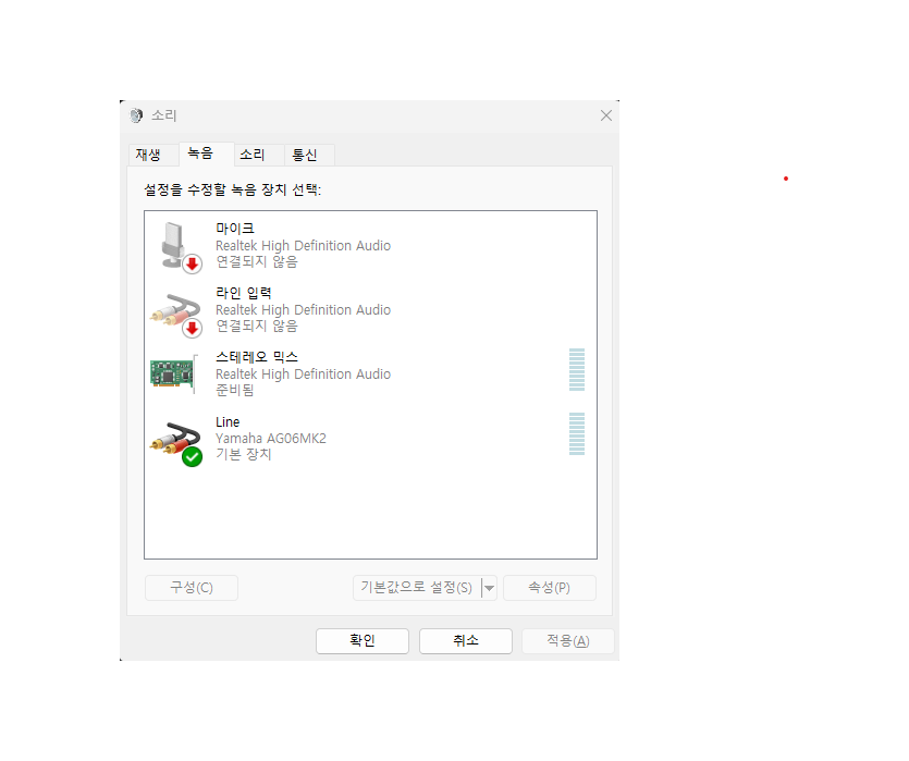 현재 장치는 제대로 잡혀있는것으로 보이고 ag06의 모드는 input mix 인지 확인해주세요. 오디오 인터페이스의 마이크 볼륨이나 gain이 작지는 않은지